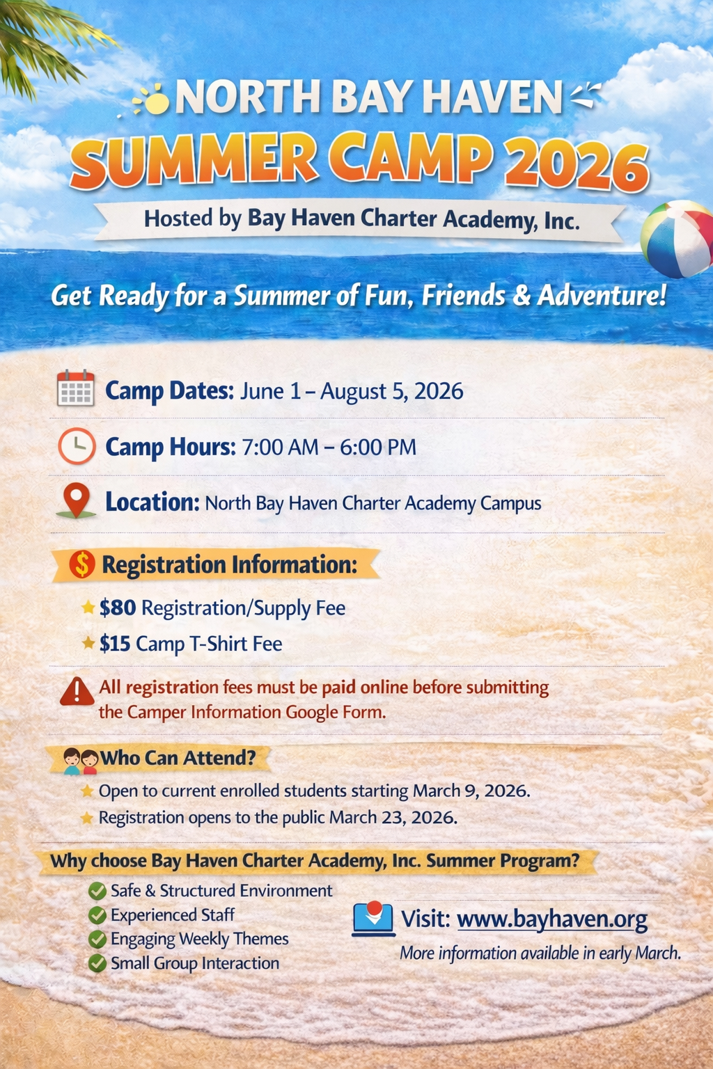 The $80 registration/supply fee and $15 T-shirt fee are due at the time of camper enrollment. Payments can be made on the school website. Payment of fees secures placement in the 2026 summer program. Please put the amount paid and confirmation number in the appropriate section when submitting your camper’s google form.